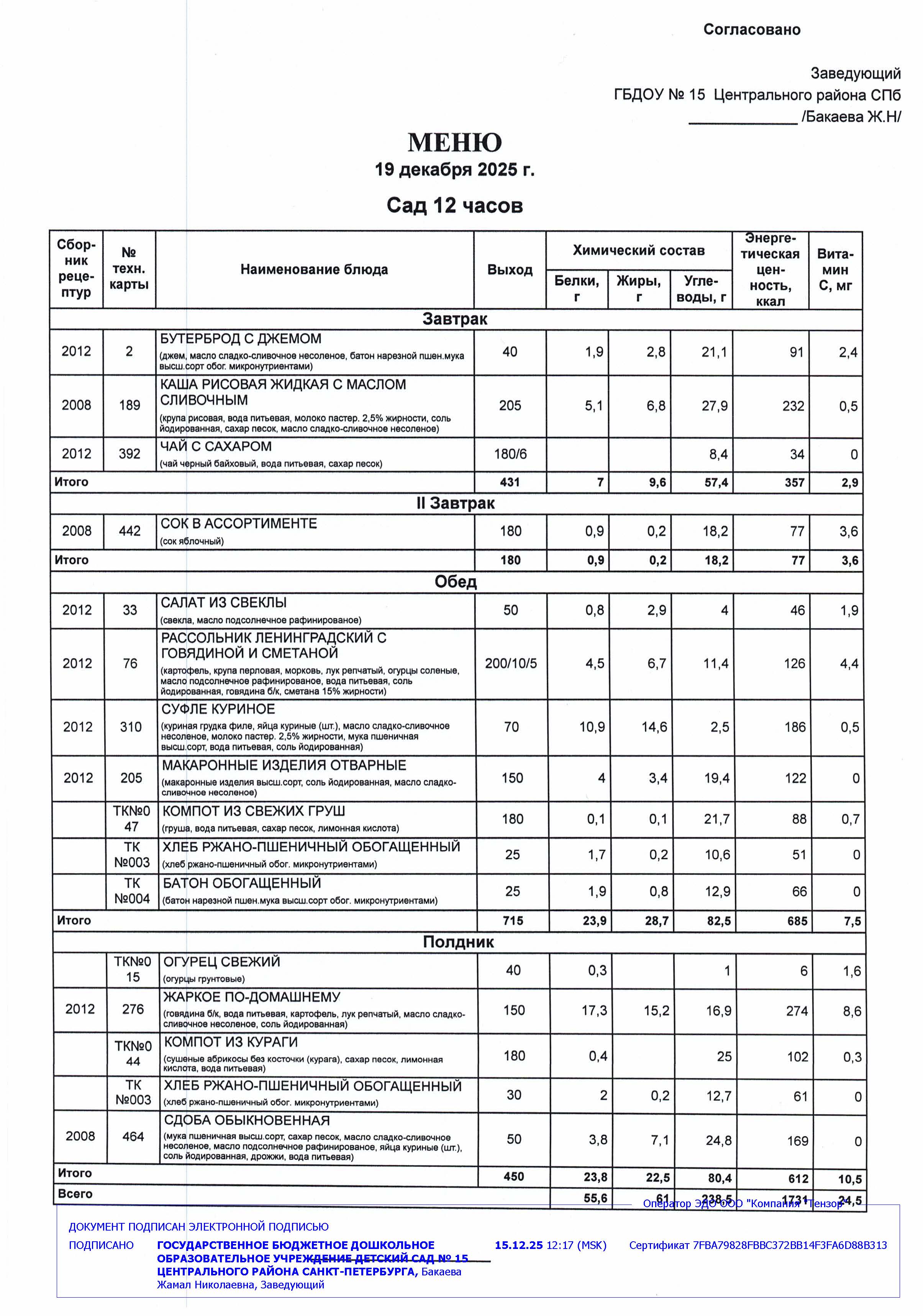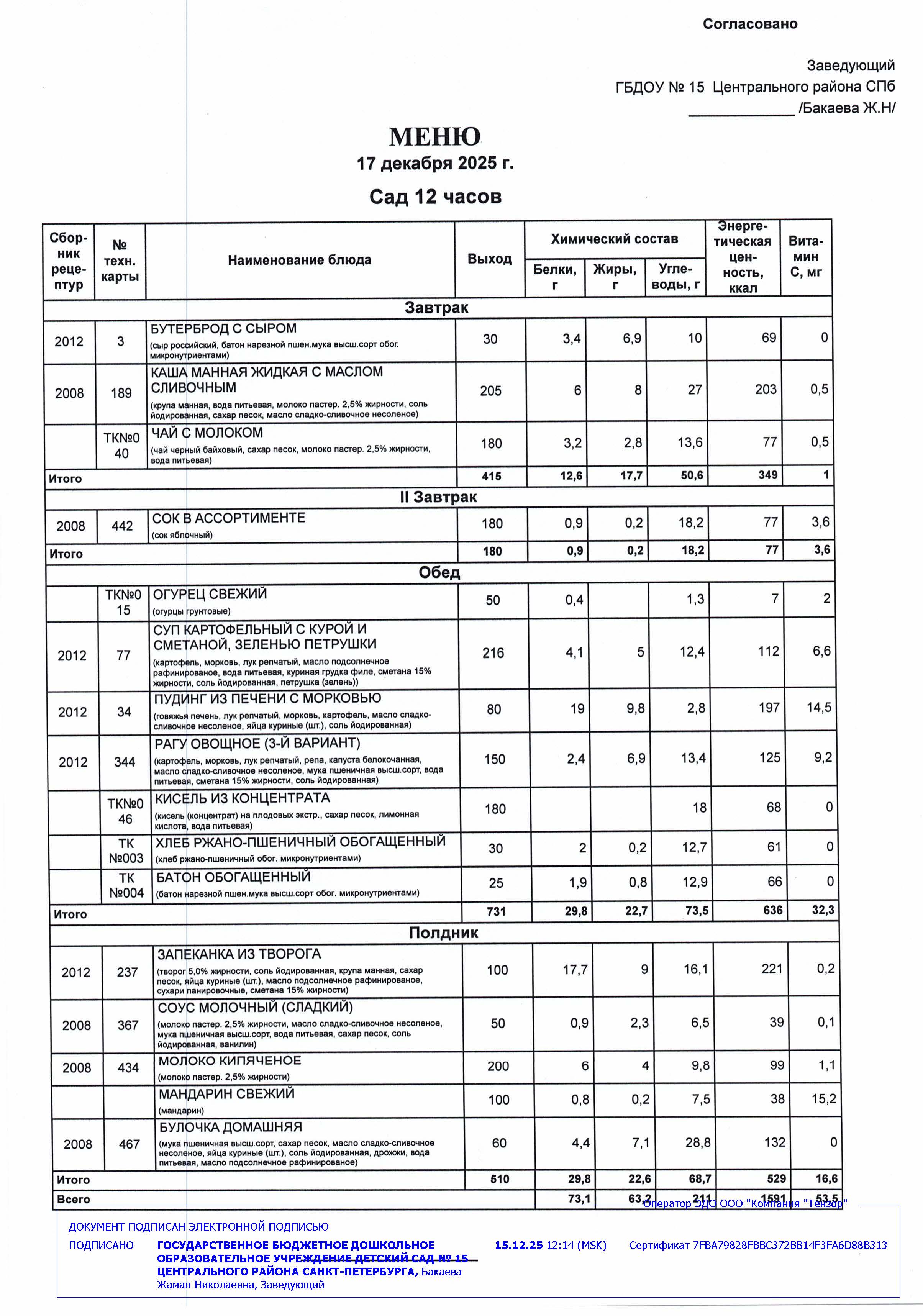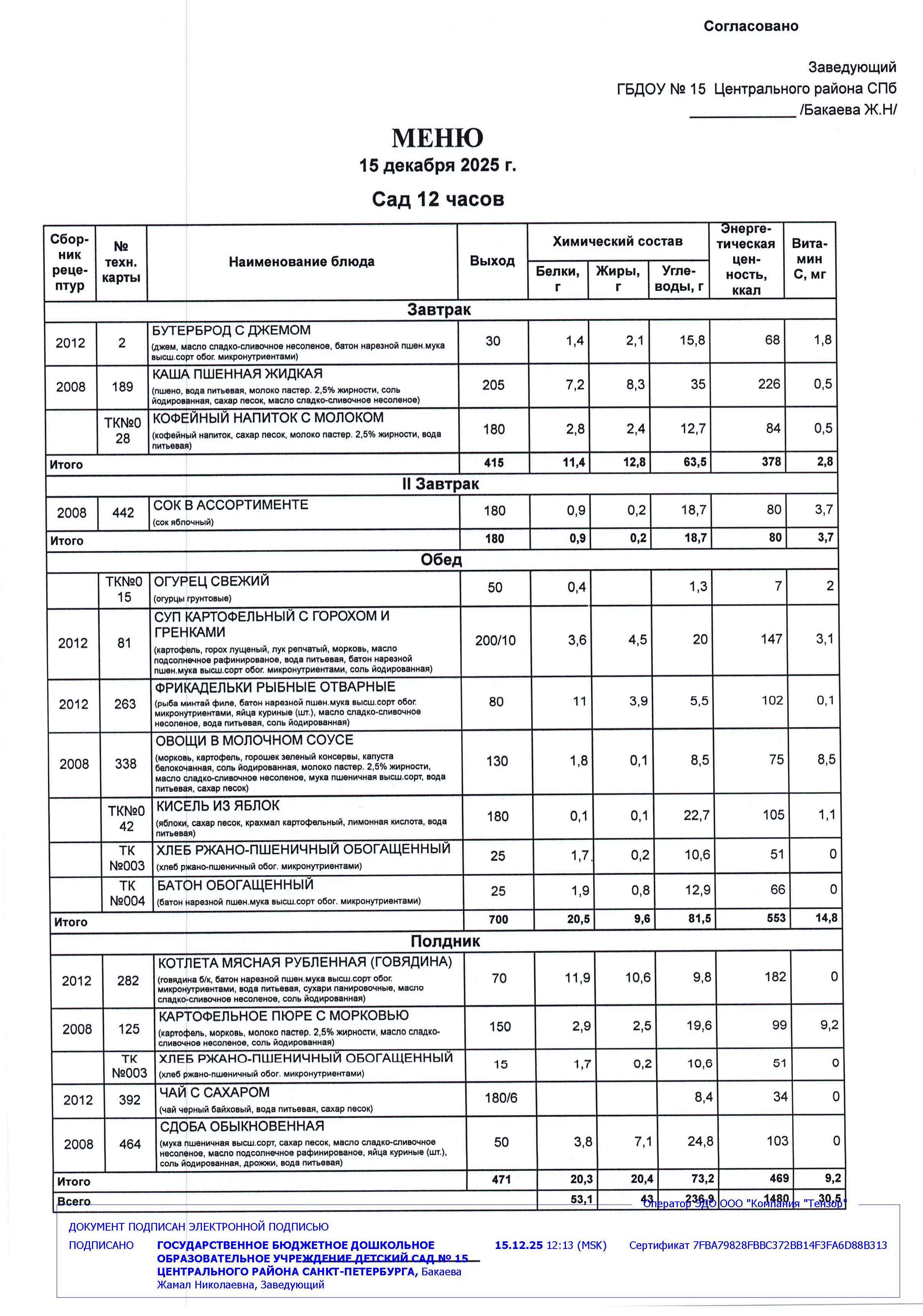 По всем вопросам организации питания в ГБДОУ №15 обращаться к заведующему ГБДОУ