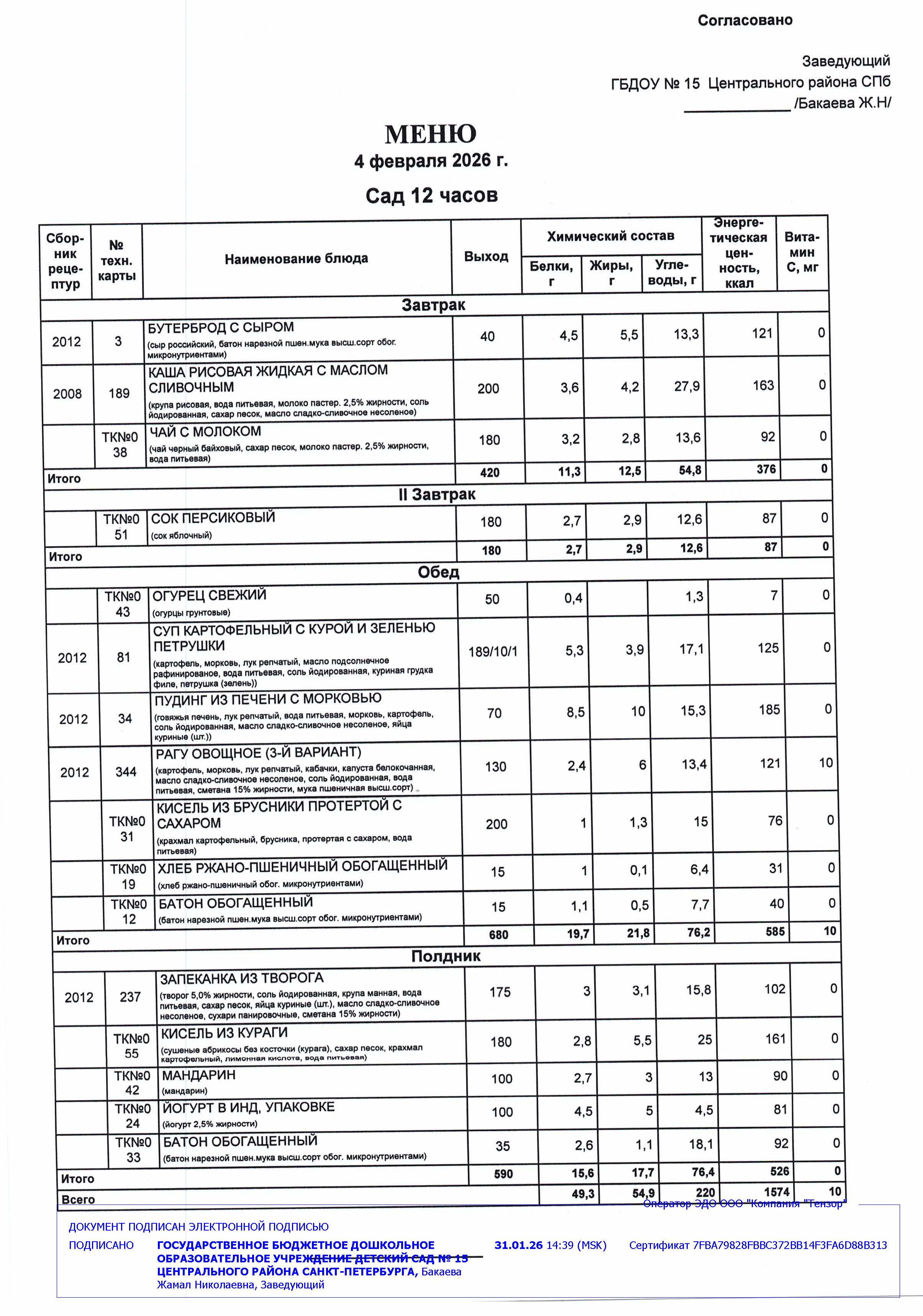 - Приказа «О введении в действие примерного цикличного десятидневного меню для организации питания детей в возрасте от 3 до 8 лет, посещающих с 12 часовым пребыванием дошкольные образовательные учреждения Санкт- Петербурга, в соответствии с физиологическими нормами потребления продуктов». Меню утверждено 05.04.2012 г. начальником Управления социального питания Правительства Санкт- Петербурга Н.А.Петровой.
